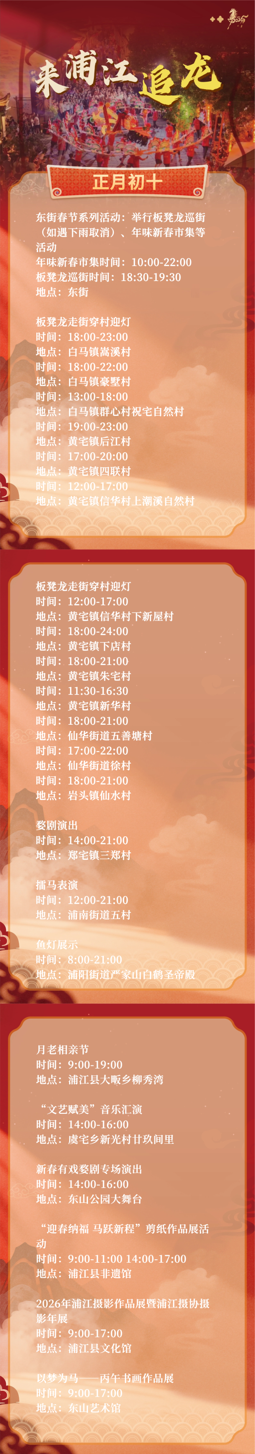 龙舞浦江,灯火映万家!今年春节,浦江为您展开一幅鲜活的年俗画卷——东街古巷里,人气龙灯夜游流光璀璨;全县板凳龙首次“大比舞”,锣鼓声震云霄;乡村“追龙”打卡,烟火气十足。牛清汤的暖、米筛爬的韧,更让年味醇厚。即日起,我们将按日历每日推送当日精彩活动,收好这份活动日历,日日有精彩、处处可游玩,跟着指引,在浦江过个地道热闹的中国年!