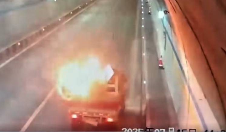 2025年7月15日,武九高速下行线高楼山隧道K493+877处,一辆货车突发自燃,起火原因是司机将打火机遗落在车辆后仓,经夏季高温暴晒引发火灾。
