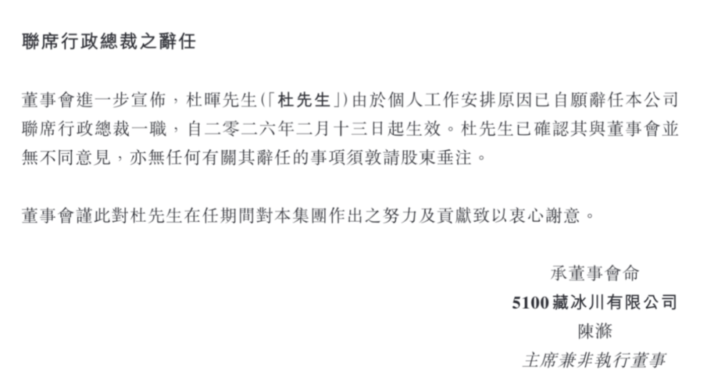 然而,在盈利预告公告的结尾,公司仅用一百余字披露了杜晖辞任联席行政总裁的消息。