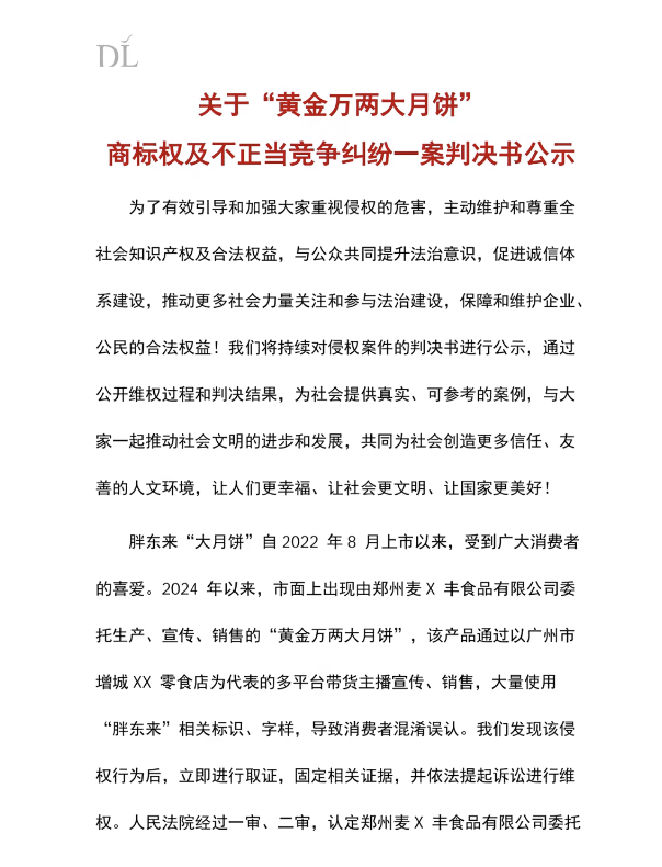 公示内容显示,胖东来的“大月饼”自2022年8月推出后,便受到众多消费者的青睐。然而从2024年起,市场上出现了由郑州麦X丰食品有限公司委托生产、宣传和销售的“黄金万两大月饼”,该产品借助以广州市增城XX零食店为代表的多平台带货主播进行推广与售卖,并且大量使用“胖东来”相关的标识和字样,致使消费者产生混淆和误认。胖东来在发现这一侵权行为后,第一时间展开取证工作,固定相关证据,并依法提起诉讼以维护自身权益。