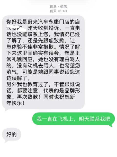 蔚来相关人员对此表示歉意,称了解情况后认为其中存在误会,顾客当时是正常礼貌回应,销售没有理由和动机骂人,可能是销售与同事说话时被顾客误解。