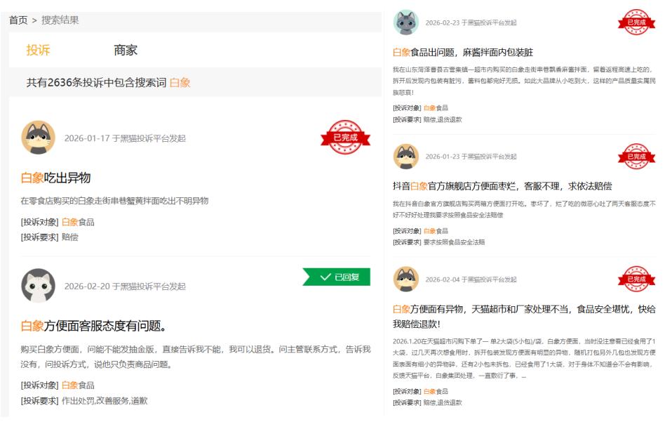 产品短板与诚信缺失的叠加影响,直接导致市场反馈持续恶化。仅在黑猫投诉,截至2026年2月,关于白象食品的相关投诉已达2636条。近期投诉集中在食物变质、包装内有异物等食品安全问题,同时涵盖虚假宣传、售后响应迟缓等多个维度。
