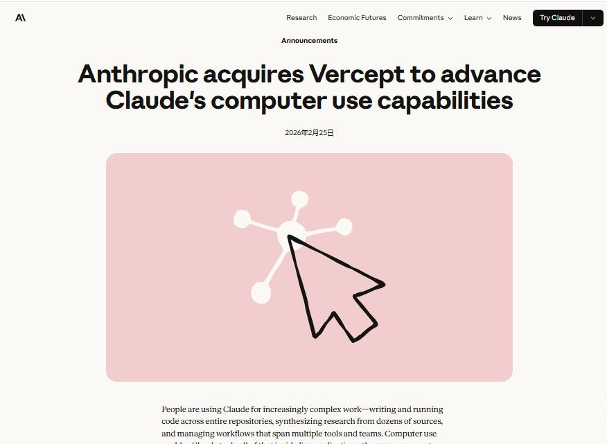 2月25日(当地时间),Anthropic宣布收购西雅图AI初创企业Vercept,旨在弥补其智能体工具“Computer Use”的视觉短板。