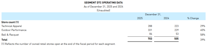 门店方面,2025年第四季度,萨洛蒙新增39家门店,主要集中在大中华区。2025年全年,该品牌所在的户外性能板块DTC门店增至331家,超过技术服装板块的288家。