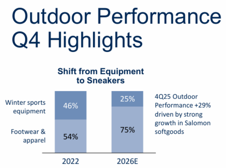 亚玛芬在财报中表示,2025年第四季度,户外性能板块的增长主要由萨洛蒙软商品的强劲增长推动。2022年,萨洛蒙冬季运动装备与鞋服商品的比重约为1:1,公司将增加高潜力软商品比重,预计到2026年调整为1:3。