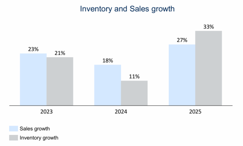 数据显示,2023-2025年,亚玛芬的销售收入增速与库存增速分别为23%/21%、18%/11%、27%/33%。近三年来,集团销售增速首次低于库存增速,且库存增长首次突破30%。