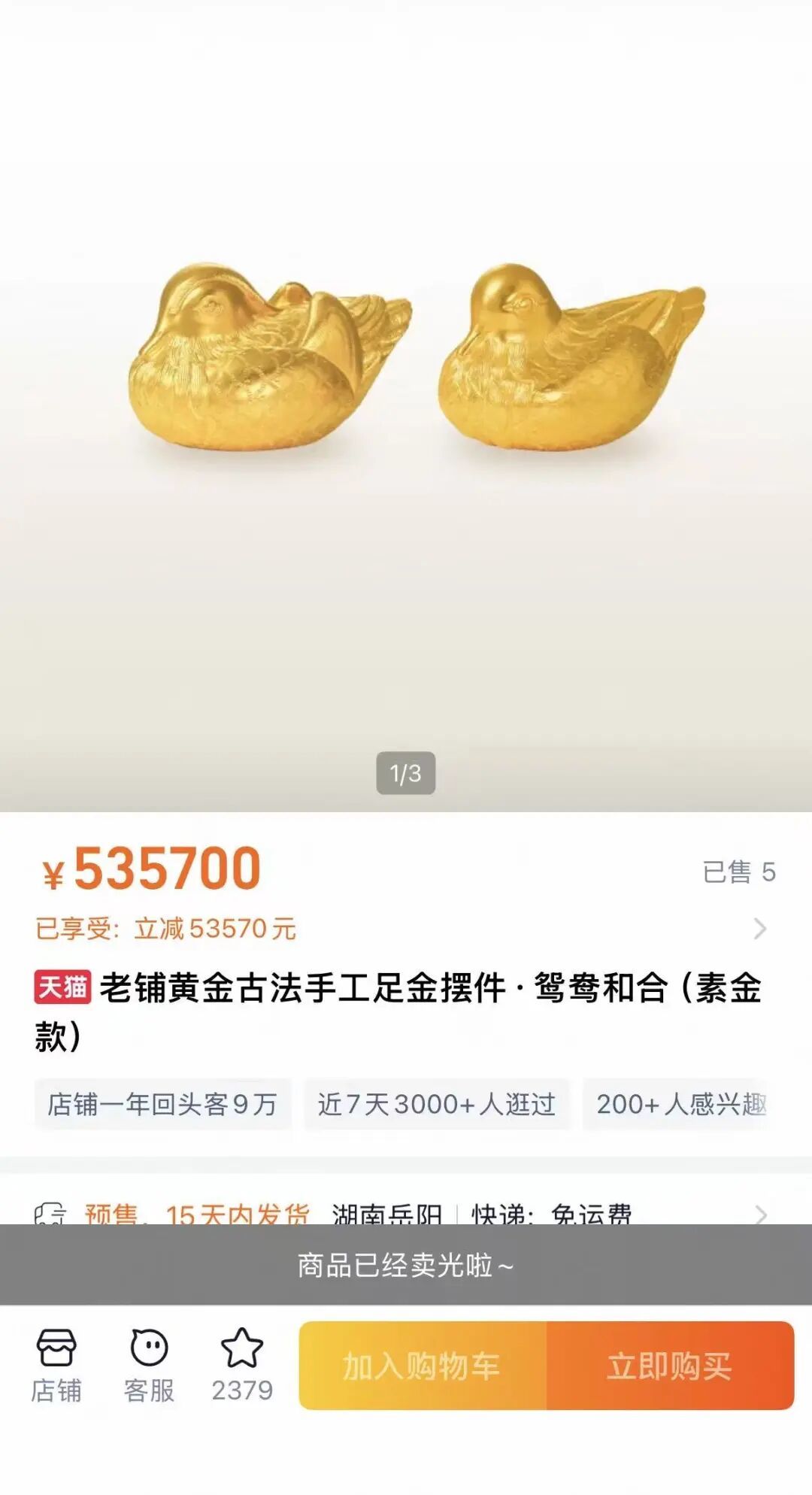 据了解,活动开售不到10分钟,店内大部分产品就已售罄,其中包括售价17万元的黄金貔貅、超过30万元的黄金蟾蜍、超过50万元的黄金鸳鸯摆件以及超过60万元的金碗等高价商品。