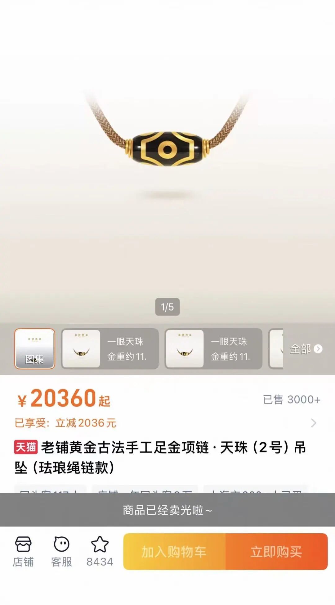 记者留意到,2月26日,老铺黄金淘宝官方旗舰店上的多款热销产品,如七子葫芦、天珠、花丝八宝吊坠等已售罄。多款产品售罄的原因是品牌天猫旗舰店在2月26日14时开启了“满1000减100”的促销活动。
