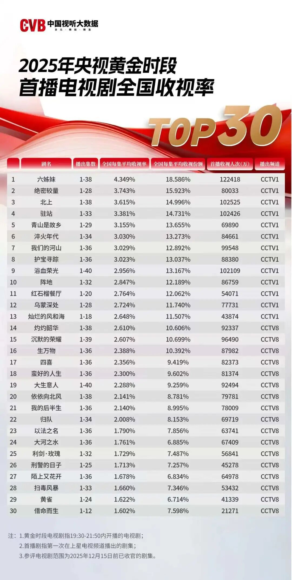 比如,在2025年央视黄金时段首播剧收视率TOP10中,没有一部剧的网播热度破万或破三万,台网双端数据不成正比。TOP30中,仅有《生万物》《蛮好的人生》《以法之名》三部剧的网播平台热度破万。