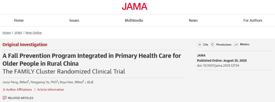 ①Peng J, Ye P, Nan B, et al. A Fall Prevention Program Integrated in Primary Health Care for Older People in Rural China: The FAMILY Cluster Randomized Clinical Trial. JAMA. Published online August 25, 2025. doi:10.1001/jama.2025.12724