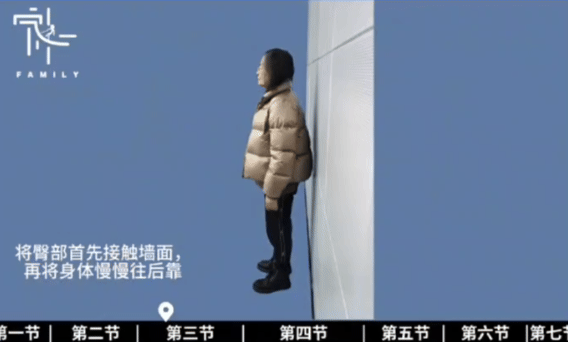 靠墙站立,双脚向前迈约30厘米,与肩同宽;臀部先贴墙,身体后靠使背部紧贴墙面,缓慢弯曲膝盖下蹲,尽量让大腿与地面平行、小腿垂直地面,注意膝盖与脚尖方向一致;保持15秒后站起休息10秒,重复5次。