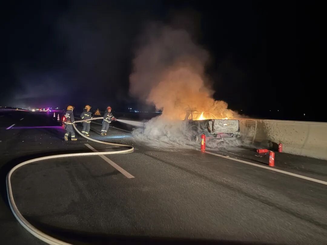 案例二:2026年2月10日,广西北海合浦县铁山港跨海特大桥上,一辆汽车突发火灾。消防员到场后发现车辆停在应急车道上,火势正处于猛烈发展阶段,经过紧急处置才化险为夷。