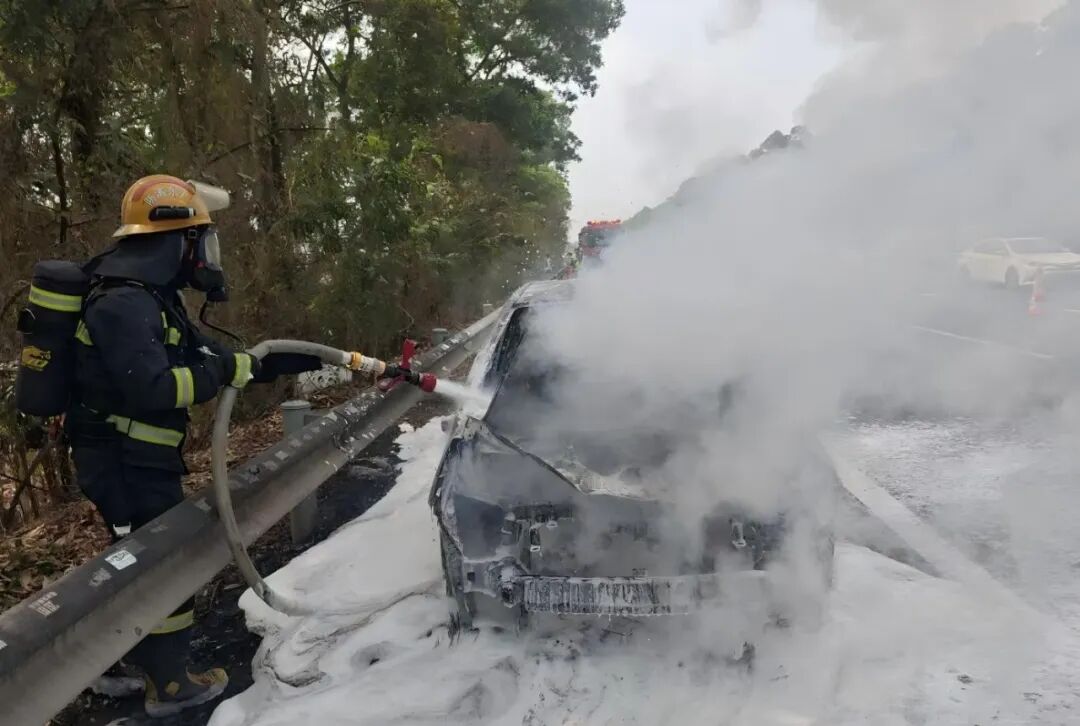 案例一:2026年2月21日,江肇高速花都方向K208处,一辆小型客车突发自燃停在应急车道上,车身被大火包围,黑烟滚滚,情况十分危急。幸运的是,消防救援力量及时赶到并展开灭火,事故未造成严重后果。