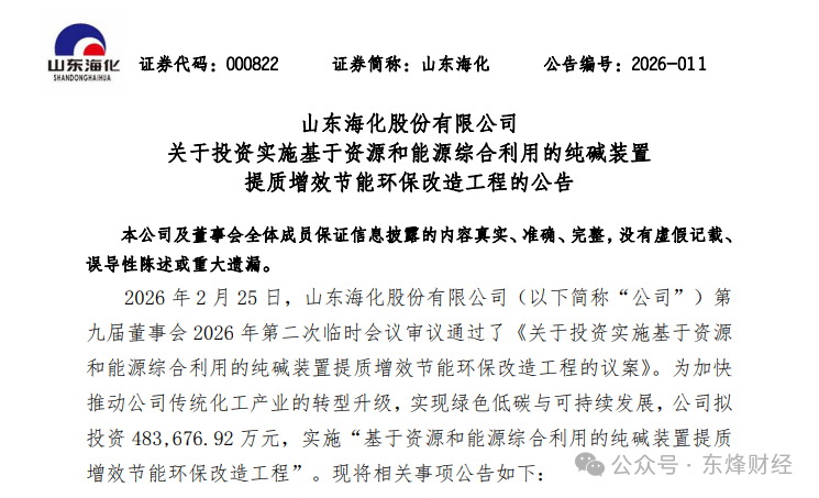 2月25日晚间,山东海化(000822.SZ)发布公告,为推进传统化工产业转型升级,实现绿色低碳与可持续发展,公司计划投资48.37亿元实施“基于资源和能源综合利用的纯碱装置提质增效节能环保改造工程”,该议案已获董事会通过。