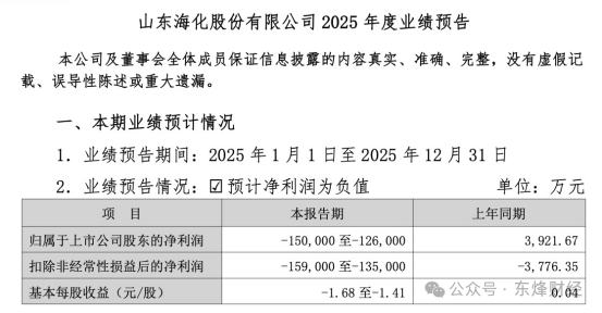 值得关注的是,1月31日山东海化曾发布预亏公告,预计2025年归属上市公司股东净利润为-12.6亿元至-15亿元(2024年为0.39亿元),扣非净利润为-13.5亿元至-15.9亿元(2024年为-0.38亿元)。