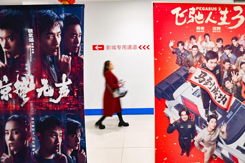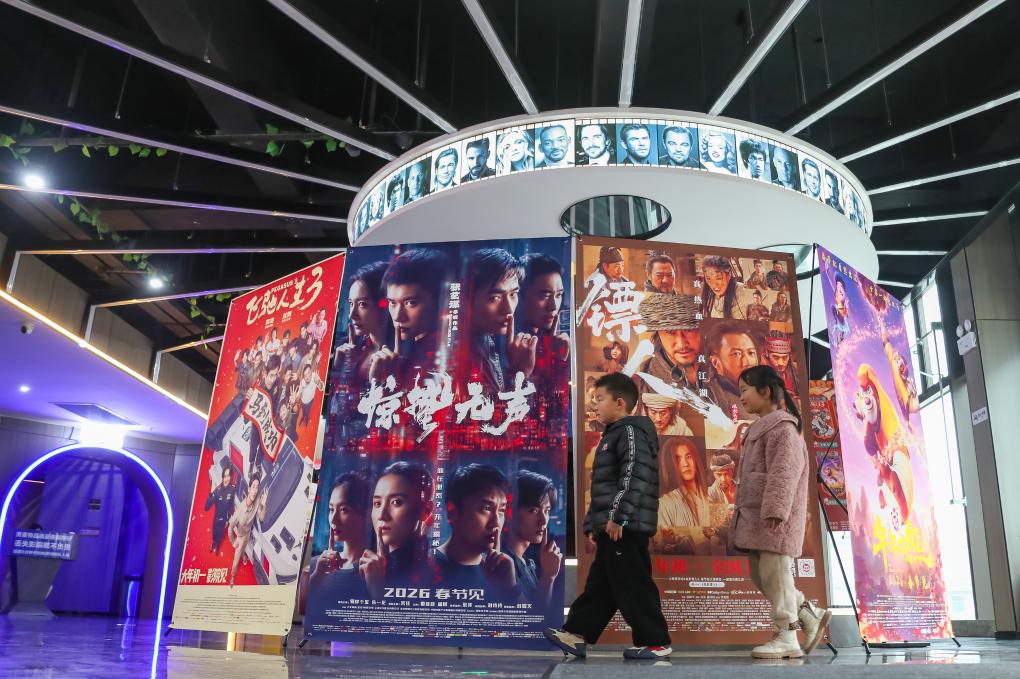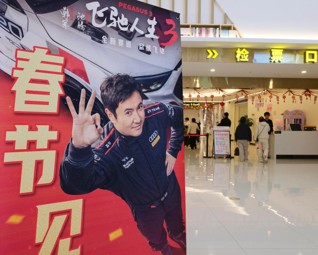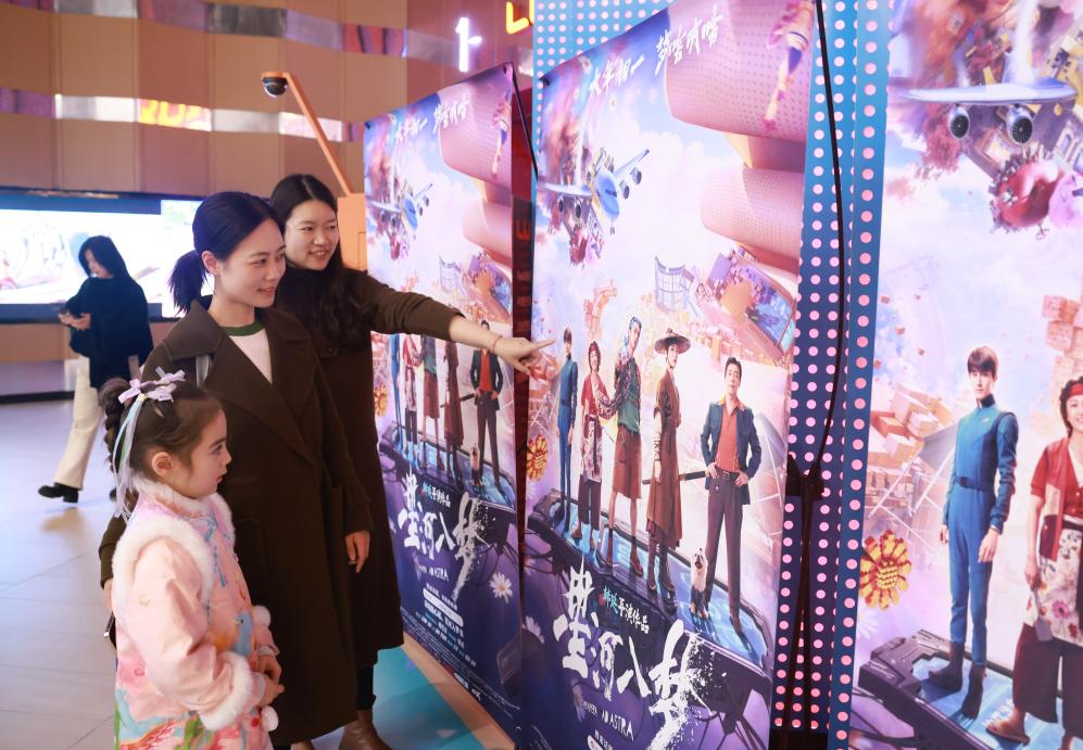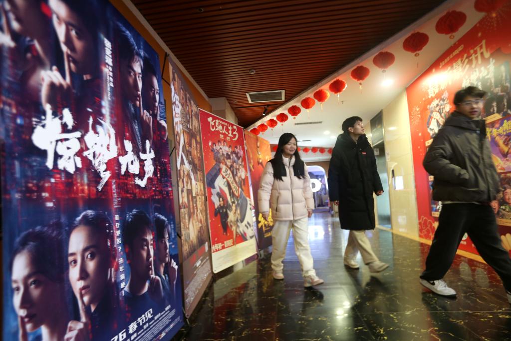 2月20日,在山东省青州市的一家影城,观众从电影海报旁经过。这张照片由新华社记者王继林拍摄。