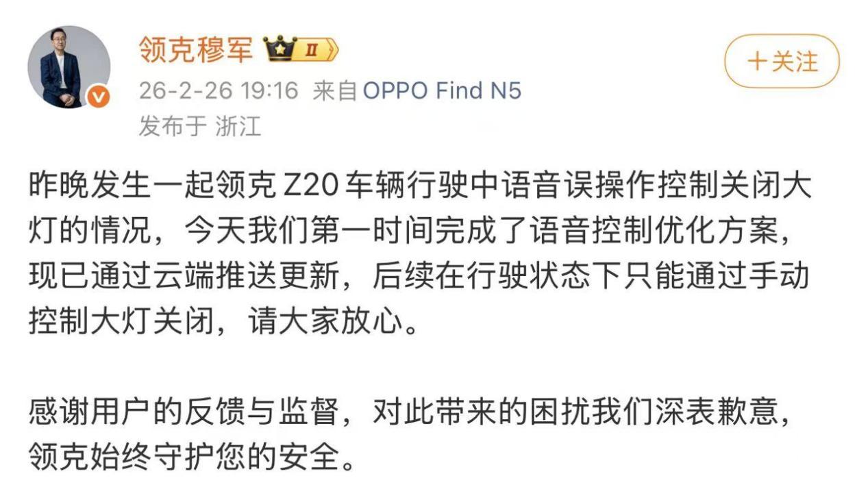 2月26日,领克汽车销售有限公司副总经理穆军在社交平台发文称,已关注到领克Z20行驶中因语音误操作关闭大灯的情况,第一时间完成了语音控制优化方案,目前已通过云端推送更新,之后车辆行驶状态下只能手动关闭大灯,并对该事件带来的困扰表示歉意。