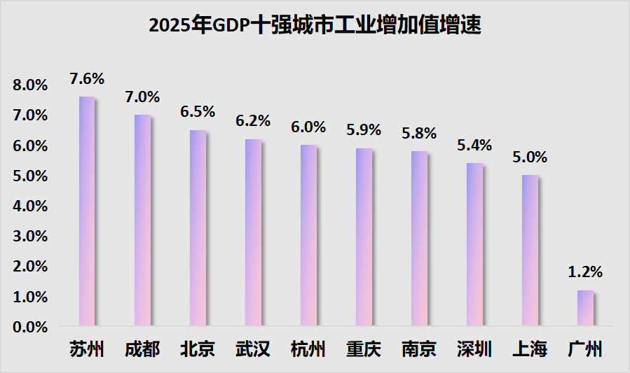 如今的强省会已摒弃过去的简单扩张模式,转向产业驱动。以四川成都为例,其工业占比曾“未强先降”,2024年规上工业营收1.8万亿元,低于佛山、东莞等城市。成都正通过强化制造业补短板:2024年上半年工业投资连续12个月增长超40%,前三季度工业投资增长18%,制造业投资增长18.9%,高技术制造业投资增长21.6%。2025年,成都规上工业增加值增长7%,增速在十强城市中居第二,GDP增速5.8%领跑十强,新能源汽车、锂离子电池等产品产量大幅增长,产业升级成效显著。