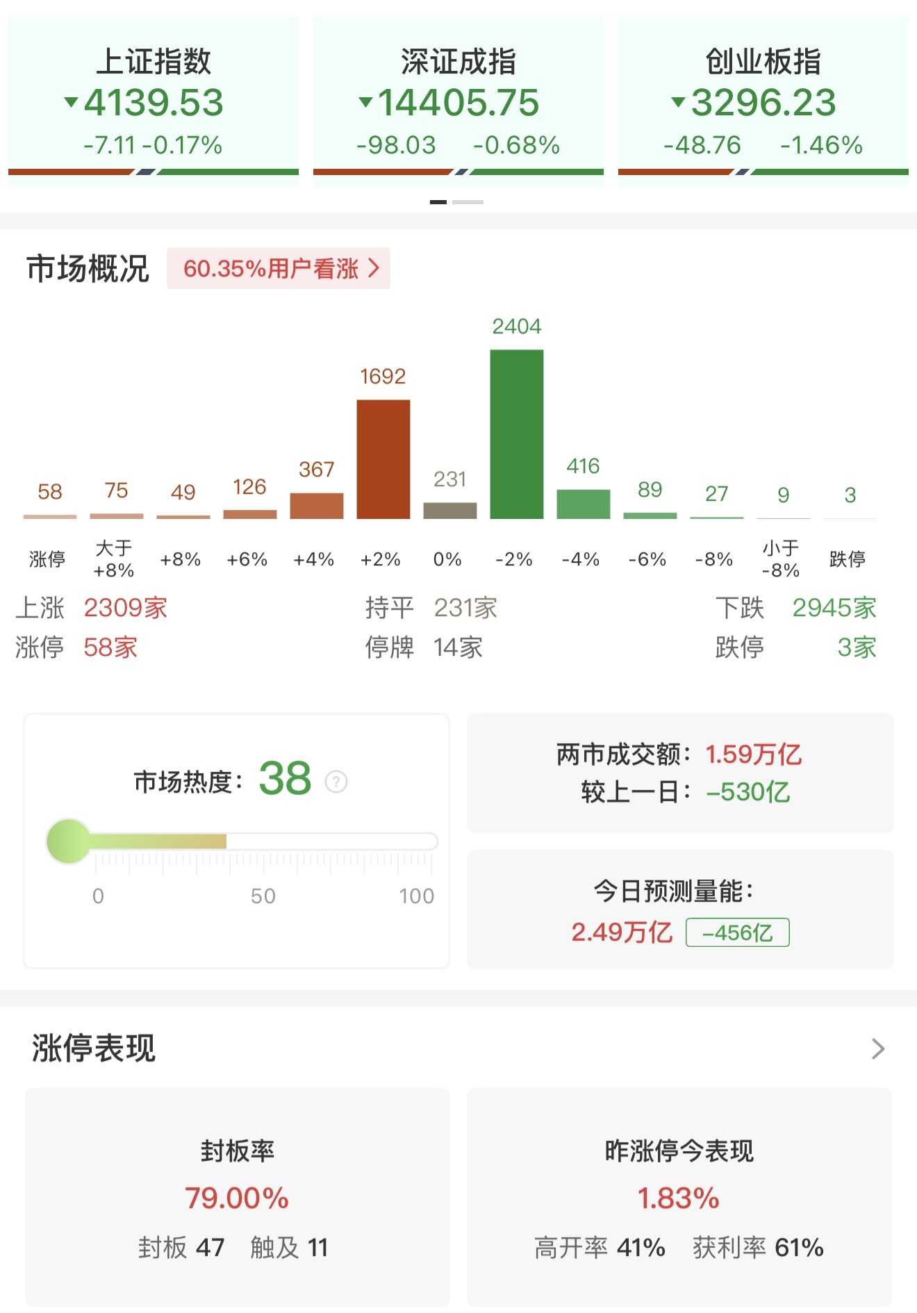 沪深两市半日累计成交额达1.59万亿元,较前一交易日缩量530亿元。盘面上热点切换速度较快,全市场超2900只个股出现下跌。