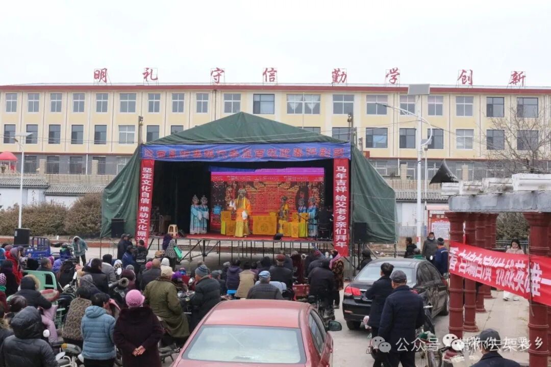 冬日的寒意挡不住热闹的氛围。演出尚未开场,戏台前已坐满了人,老人们搬着马扎抢占前排,孩子们依偎在大人怀里,连周边村的村民也特意赶来。红色地毯铺上台面,电子大屏亮起,“明礼守信、勤学创新”的标语透着朴实的期盼,整个广场都沉浸在喜庆之中。