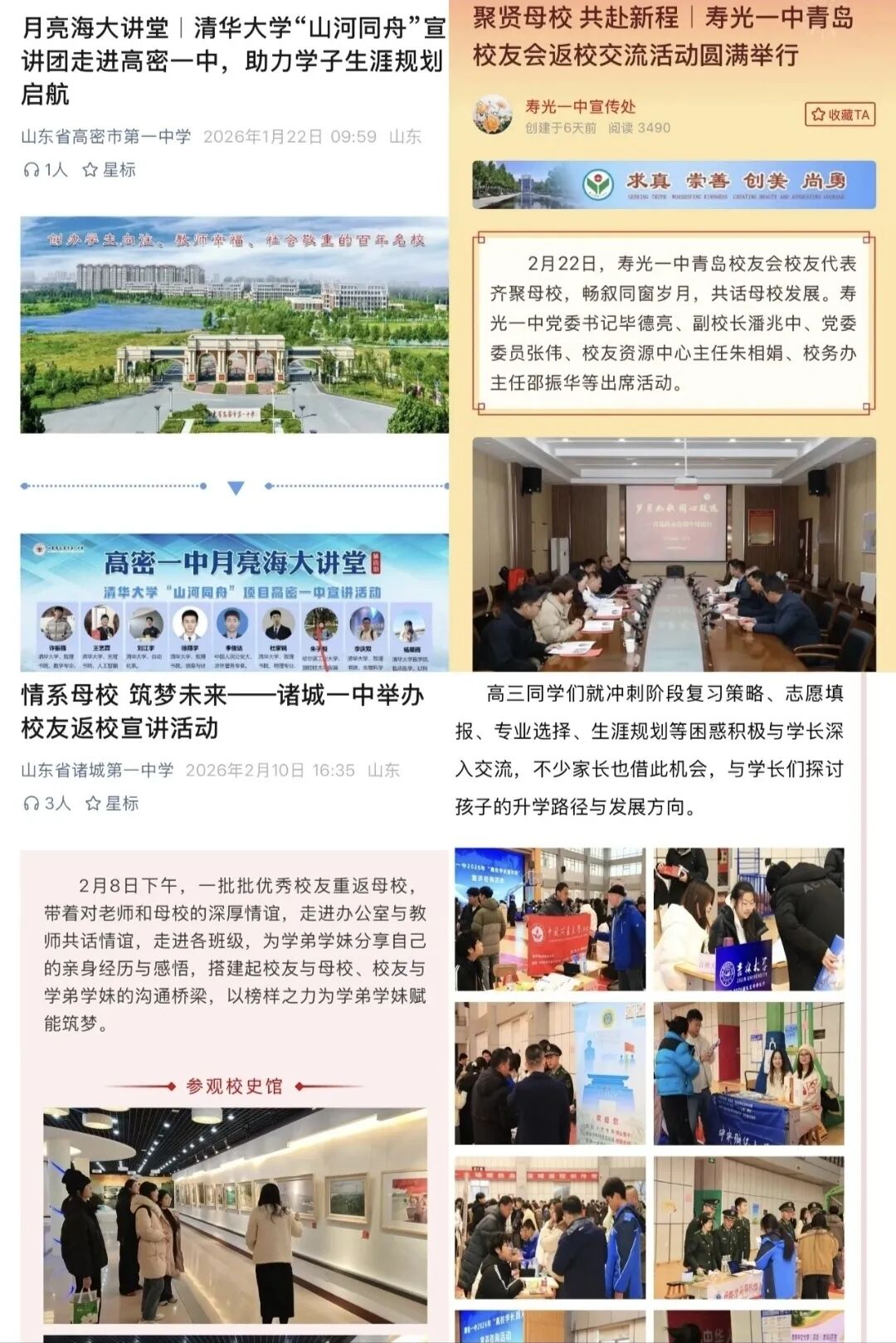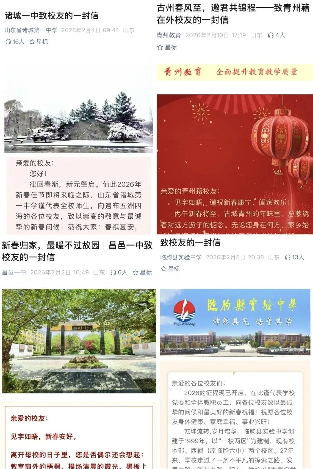 寒假伊始,潍坊多所高中便向校友发出“致校友的一封信”。青州一中、昌邑一中、临朐中学等学校的书信跨越山海,将母校的新貌与期盼传递给校友。字里行间满是对青春的追忆和对未来的邀约,让校友们的归属感与荣誉感油然而生。