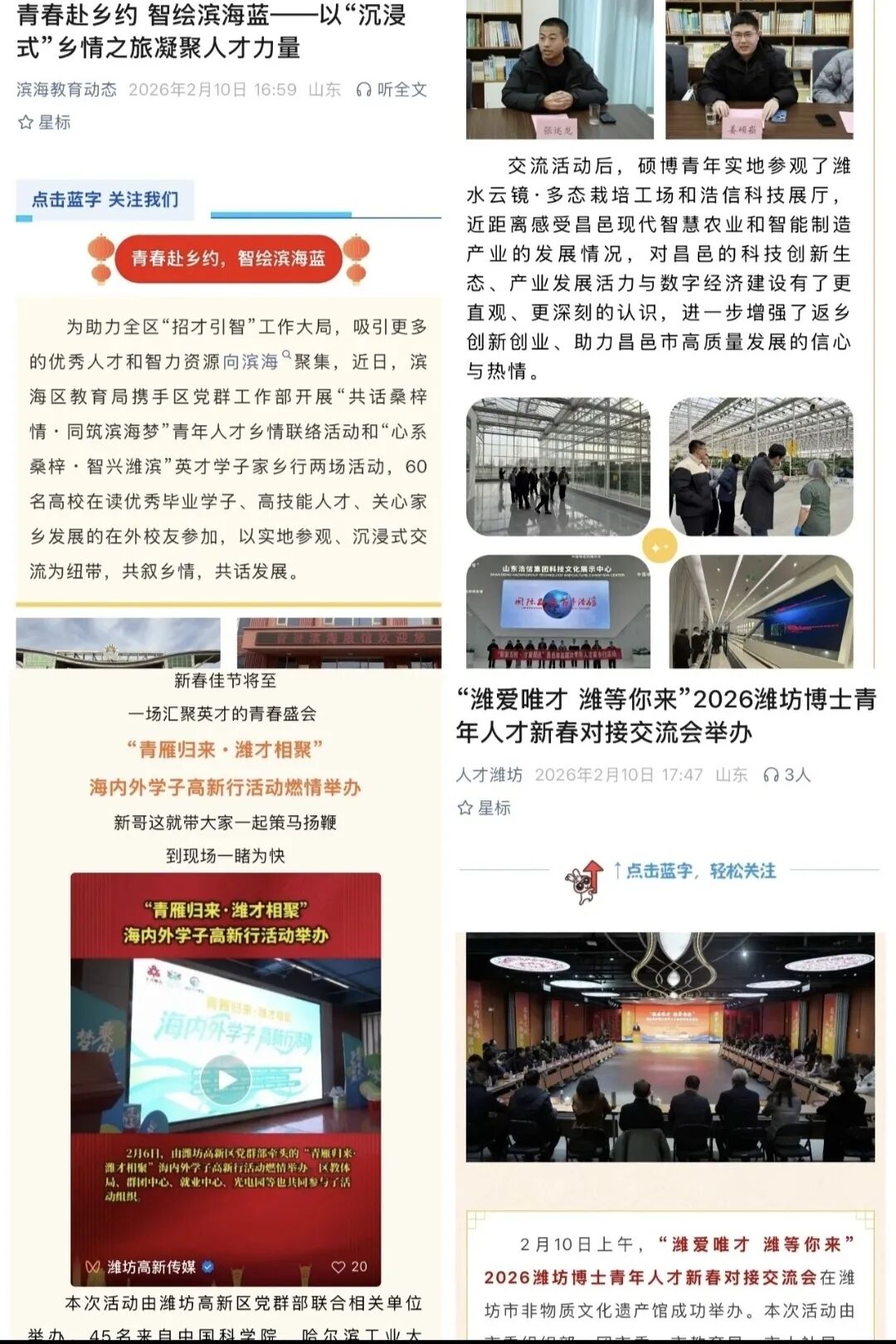 走出校园,英才学子开启家乡感知之旅。在高密、潍城、高新、滨海等地,“青鸟计划”“英才学子家乡行”活动组织数百名返乡大学生走进潍柴、歌尔、浩信科技等龙头企业,感受产业发展脉搏。昌邑市高层次青年人才新春对接交流会上,博士硕士为家乡发展建言;临朐县青年博士“看朐城”活动实现人才与产业精准对接。2月10日,“潍爱唯才 潍等你来”2026潍坊博士青年人才新春对接交流会举办,现场发布176个博士岗位需求,向海内外高层次人才发出邀请。