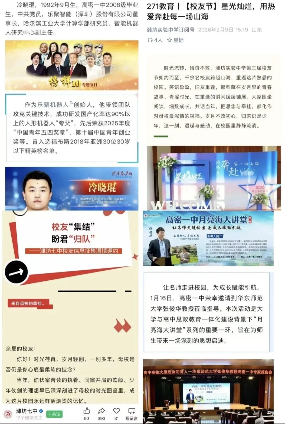 榜样力量无穷。高密一中2008级校友、乐聚机器人创始人冷晓琨登上央视《榜样10》的事迹被广泛宣传,他带领团队攻克人形机器人关键技术的故事,成为学子创新的生动教材。同时,潍坊实验中学第三届校友节、潍坊一中校友新春座谈、诸城龙城中学开放日等活动接连开展,校友欢聚叙情。华东师范大学张俊华教授、河海大学副教授周仲海等知名校友返校开讲,带来前沿思想与智慧启迪。