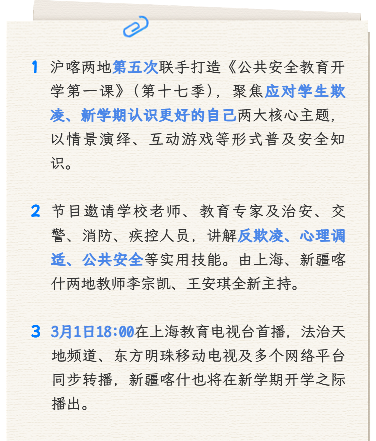 本季节目是沪喀两地第五次携手打造的《公共安全教育开学第一课》,聚焦“应对学生欺凌”与“新学期认识更好的自己”两大核心主题。节目内容详实,形式创新,通过情景演绎、互动游戏、趣味盲盒等同学们喜爱的方式,助力大家掌握安全技能、养成安全习惯,学会保护自己与他人。
