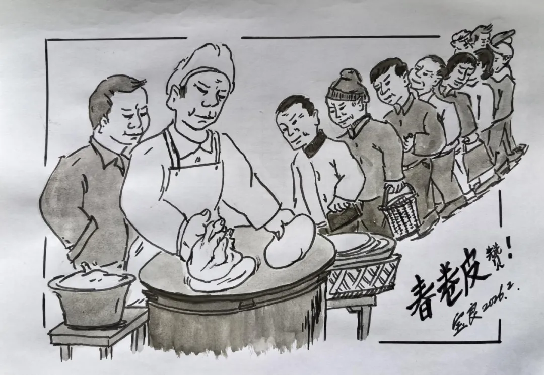 春节里,春卷作为点心很受欢迎。而春卷皮的制作很有讲究。街头的点心店、摊春卷皮的摊位生意十分红火,摊春卷皮的手艺不是谁都能掌握的,把一团厚厚的面糊在滚烫的烙板上粘一圈,烘干后就成了一张春卷皮。师傅一边粘面糊,一边还要揭下烘干的春卷皮,双手一刻不停,尤其是人多的时候,春卷皮总是供不应求。