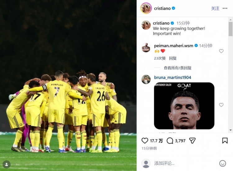C罗赛后在社交媒体庆祝球队十连胜。