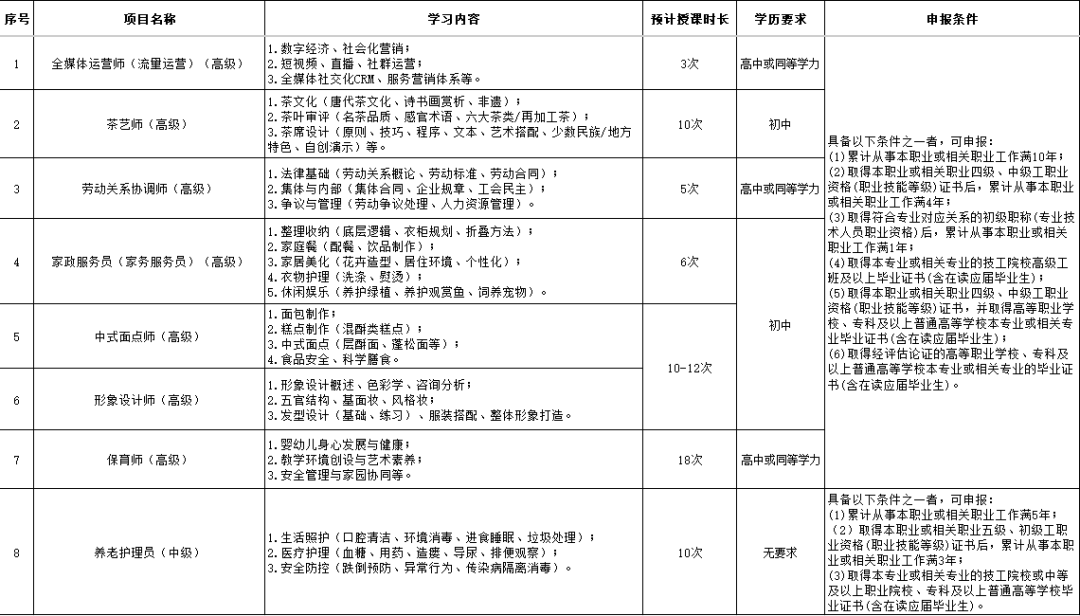 好消息!江桥镇2026年职业技能等级培训班即将开班,涵盖全媒体运营师(流量运营)高级、茶艺师高级、劳动关系协调师高级、家政服务员(家务服务员)高级、中式面点师高级、形象设计师高级、保育师高级、养老护理员中级等多个热门工种。