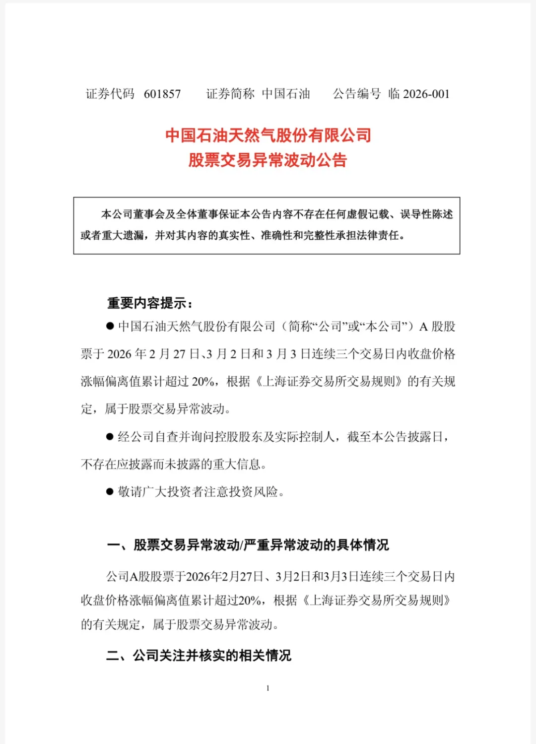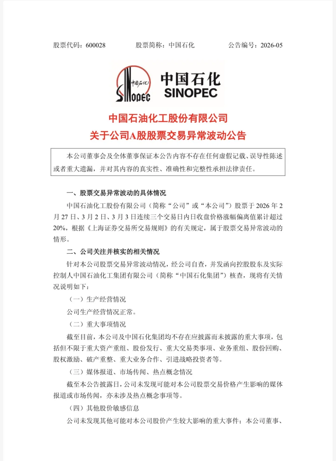 3月3日晚间,中国石油、中国石化、中国海洋石油三家能源巨头相继发布股票交易异常波动公告,披露公司股票在2月27日、3月2日、3月3日连续三个交易日内,日收盘价格涨幅偏离值累计超过20%,已构成股票交易异常波动情形。