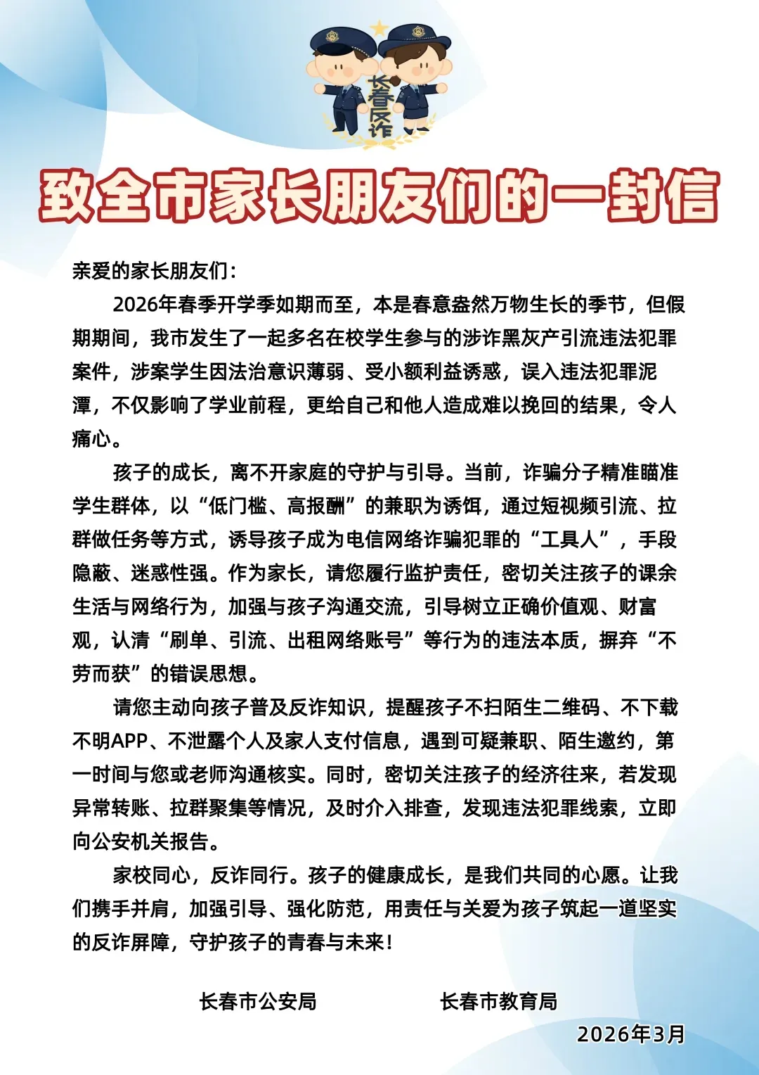 3月3日,长春市反电信网络诈骗中心发出《致全市家长朋友们的一封信》,内容如下: