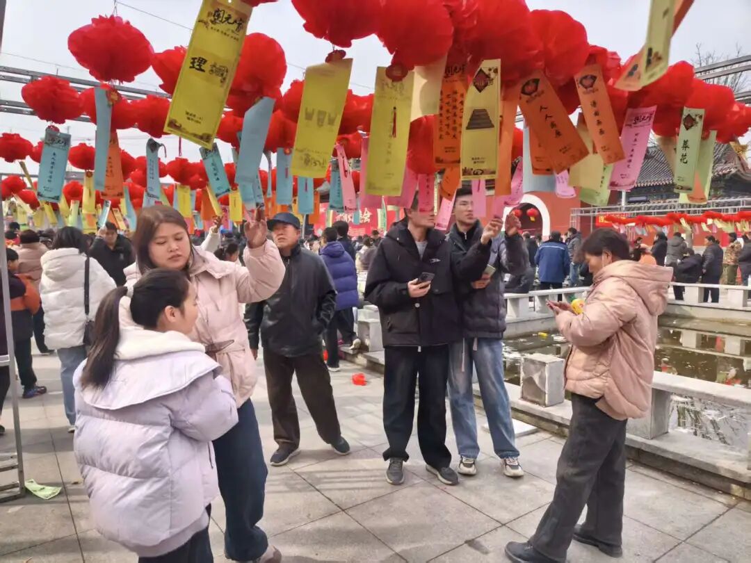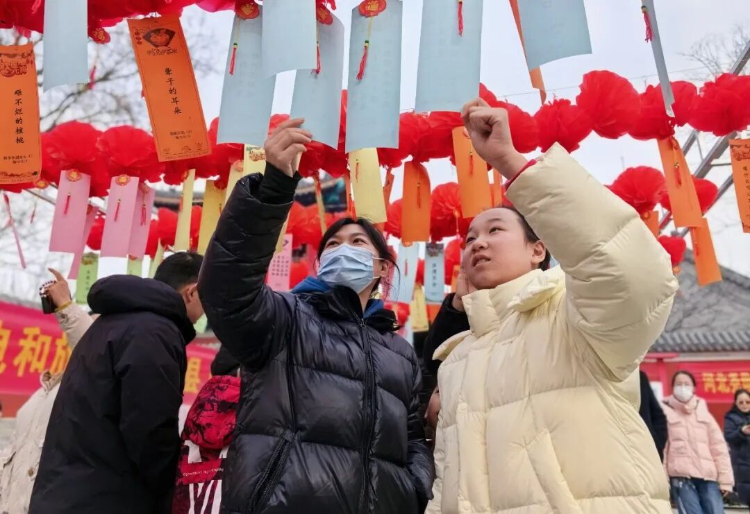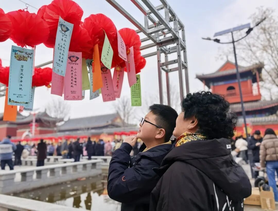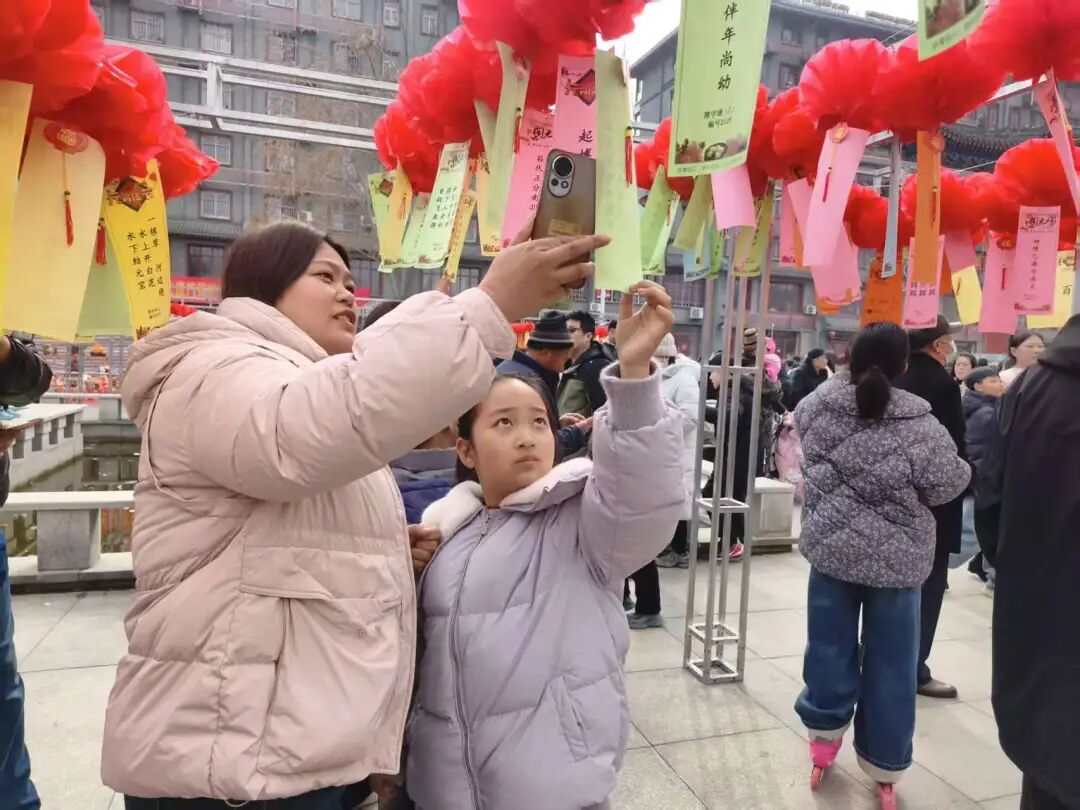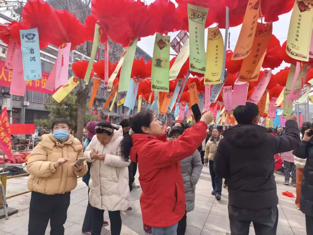 现场欢呼声不断,市民三五成群围在灯谜前:有的凝神思索,有的低声交流,有的纸笔演算,还有的带孩子读谜面、讲民俗。猜中者可领精美奖品。