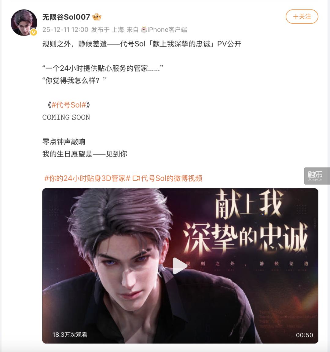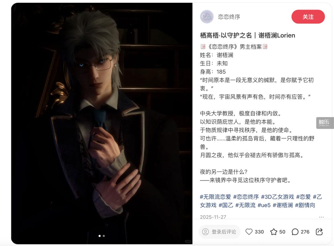 2025年10月28日,UE5引擎打造的3D无限流恋爱游戏《恋恋终序》在小红书首曝,同日女性向AI陪伴产品《无限谷》发布首支PV;12月11日,同属“无限谷”企划的《代号Sol》以3D恋爱手游定位在社交媒体发布宣传PV。