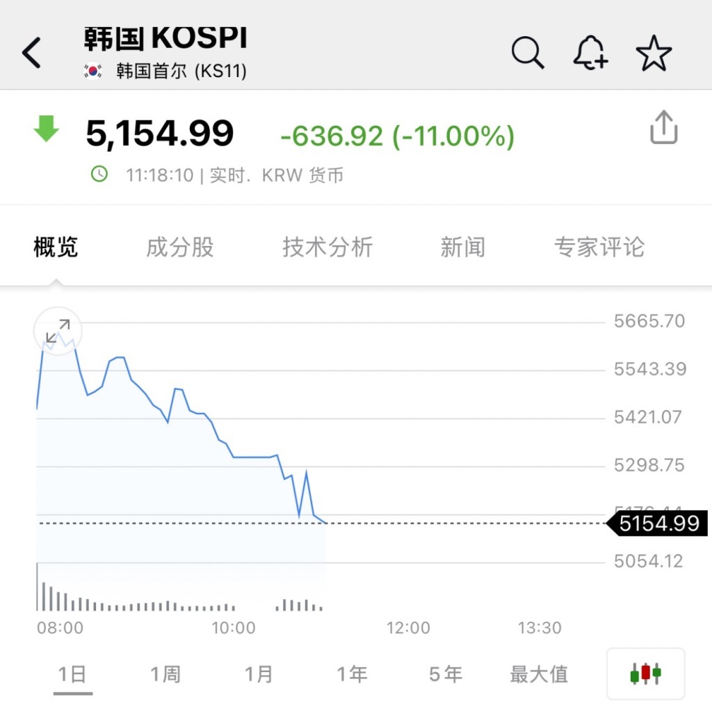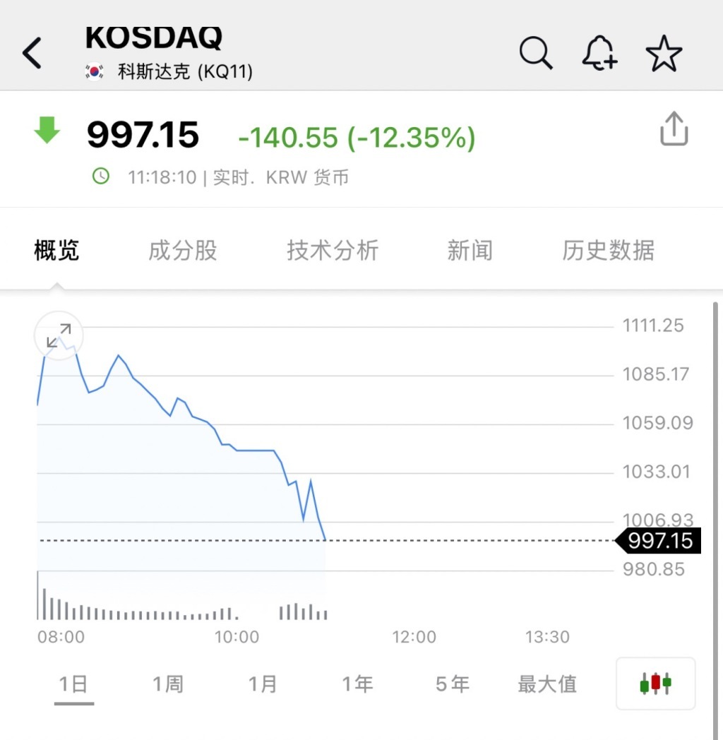 截至发稿时,韩国综指的跌幅一度扩大至11%,跌至5154.99点;韩国创业板指数KOSDAQ的跌幅则达到12.35%,跌至997.15点。