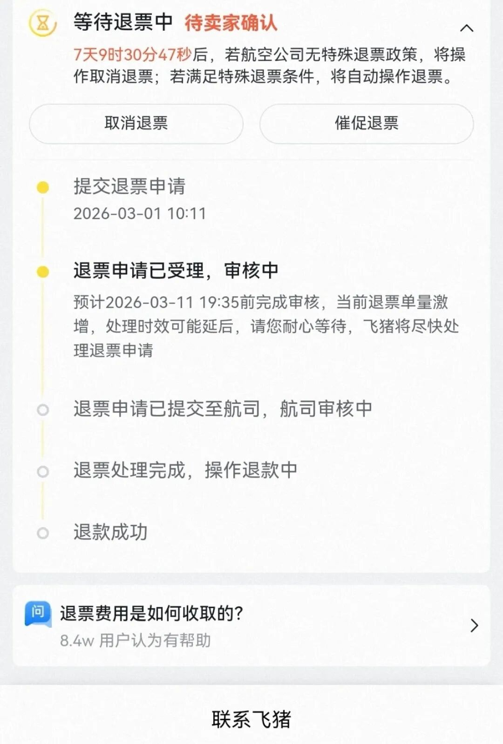 计划3月中旬出发的游客也受到了波及。旅客多多(化名)告诉《IT时报》记者,看到新闻后就决定取消3月11日阿联酋、卡塔尔航司的往返机票,却被飞猪平台告知相关航司暂无免费退票政策,只能按原票价规则执行。多多在社交平台发帖吐槽,评论区有不少网友跟帖表示有相同遭遇。