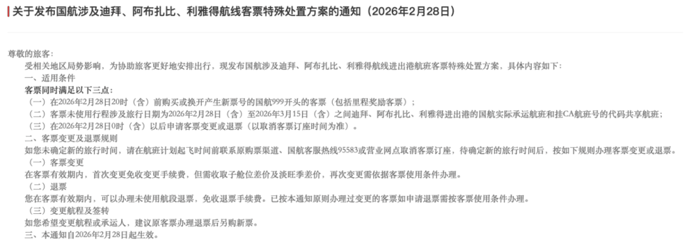 业内信息显示,国航、东航等国内航司已发布特殊处置方案,对2月28日至3月15日涉及迪拜、阿布扎比的航班,在符合条件的情况下(具体条件可查询航司官网),允许免费退改;阿联酋航空、卡塔尔航空也宣布暂停相关航线。但在实际执行中,平台与航司数据同步时效有差异、人工审核压力大,导致部分订单处理滞后。