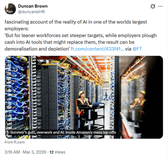 亚马逊计划年度支出超1000亿美元,大部分投进了数据中心和AI芯片。人力专家邓肯·布朗(Duncan Brown)在社交媒体X上评价:“一边压榨员工设定更高目标,一边把钱投给可能取代他们的工具,这简直是打击士气。”