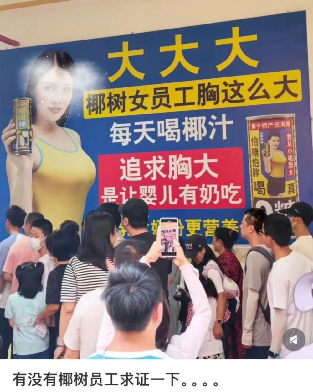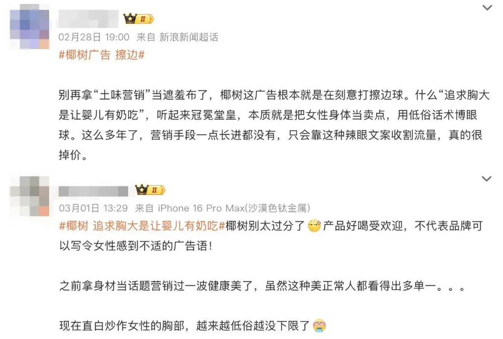 不少网友呼吁椰树别拿“土味营销”当遮羞布,认为其广告是刻意擦边