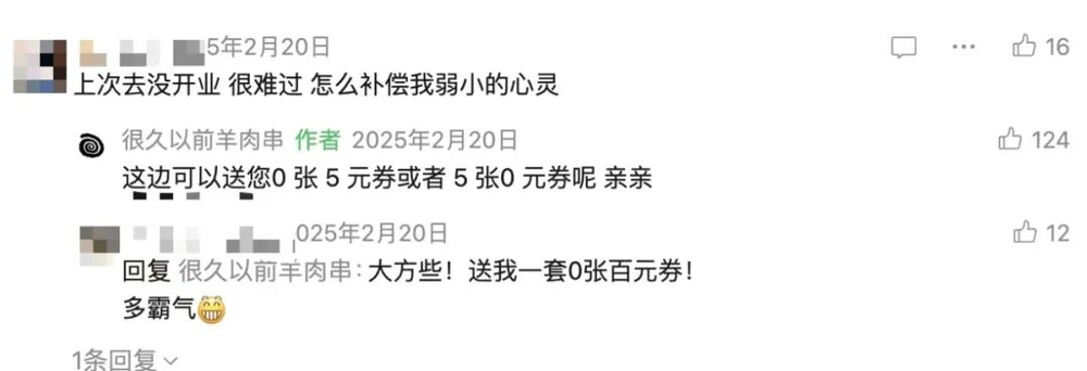 网友问:“上次去没开业很难过怎么补偿我弱小的心灵?”小编答:“这边可以送您0张5元券或者5张0元券呢亲亲。”