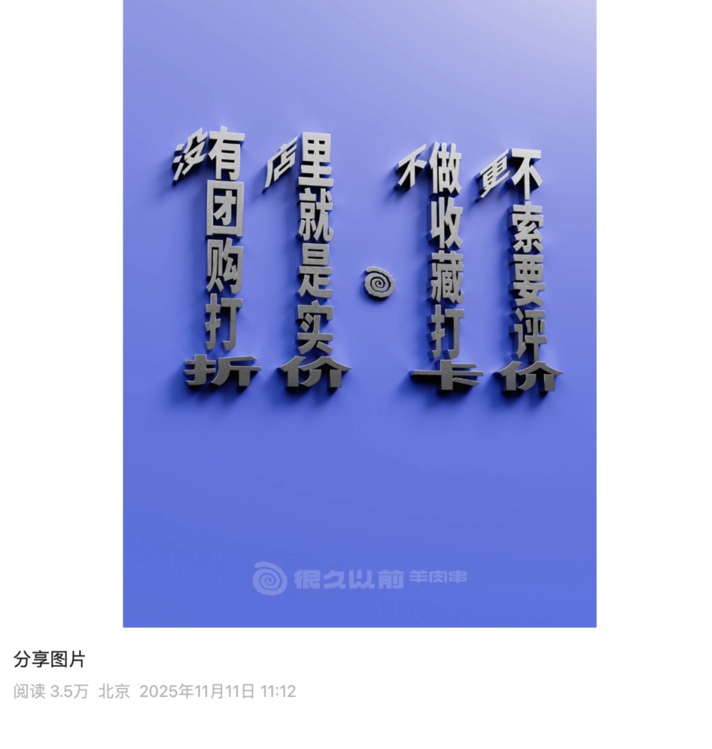 更离谱的是,连通知营业时间都懒得写文章。春节营业通知是一张海报,上面写着“虽然大部分门店春节都营业,但要手动搜点评查营业时间”;双十一别人卷优惠、玩套路,他们的海报就两句话:“没有团购打折、店里就是实价;不做收藏打卡,更不索要评价。”