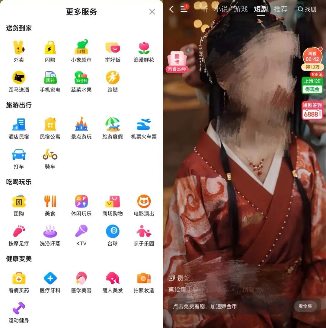 图:美团App业务展示及短剧推荐页面 来源:美团App 《听筒Tech》截图