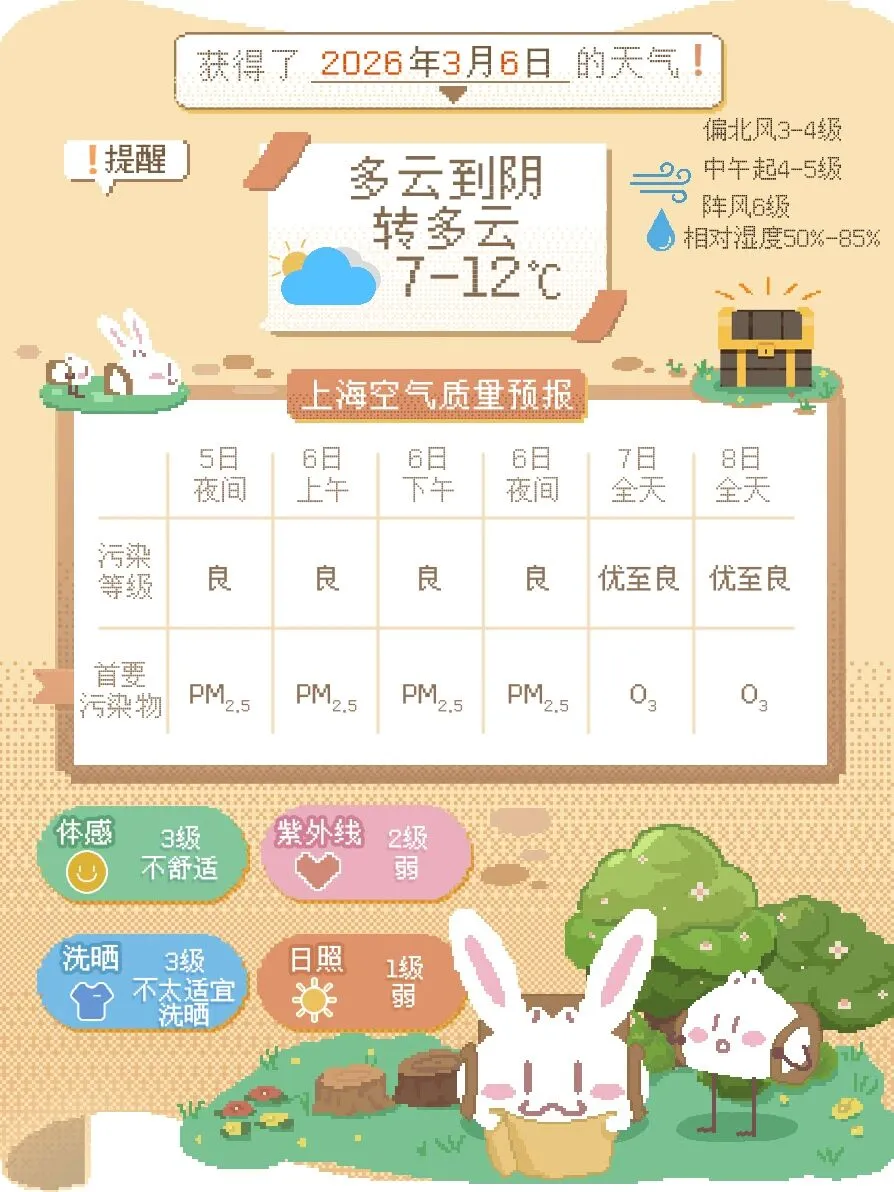 受冷空气扩散影响,3月6日早间气温普遍在7至8℃左右,白天天气以多云到阴为主,偏北风3到4级,中午起风力增强至4到5级阵风6级,沿江沿海地区可达5级阵风6至7级。预计今日最高气温12℃,气温偏低,需注意保暖,相对湿度在80%到30%之间。
