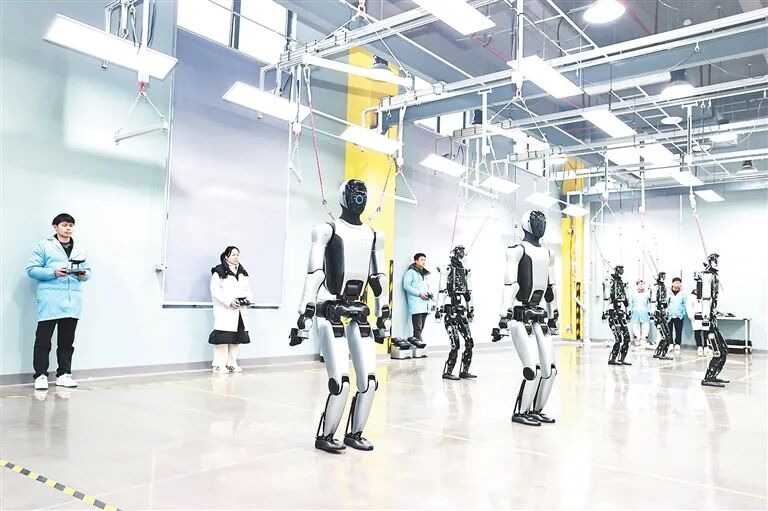 步入鄱阳湖生态科技城的九江优必选人工智能产业园,一派繁忙的生产景象映入眼帘:全省首条人形机器人Walker S2生产线高速运转,一台台机器人正完成最后的装配调试;不远处的数据采集及训练中心里,大批机器人反复练习抓取、分拣、搬运等动作,为进入真实工业场景开展“岗前培训”。从研发到制造,从训练到应用,一条完整的人形机器人产业链正在加速形成。