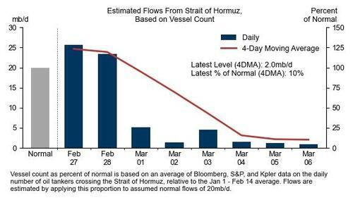 第一,高盛预计通过霍尔木兹海峡的石油流量已减少1800万桶/日——目前流量约为正常水平的10%,低于此前假设的15%。因此,高盛围绕基准情景的假设风险,进一步偏向航运流量将在更长时间内维持较低水平。