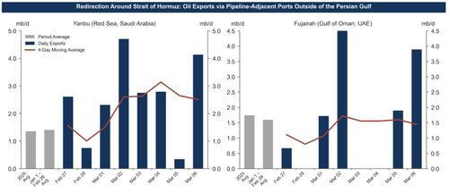 第二,高盛估计,过去四天通过管道及延布港(沙特阿拉伯红海沿岸)和富查伊拉港(阿联酋阿曼湾沿岸)的净改道量仅为90万桶/日(对比理论估计的360万桶/日潜在能力)。本周伊朗对富查伊拉港口和石油储存设施的袭击、油轮所需船用燃料的局部短缺(通常经霍尔木兹海峡从海湾进口),以及过往对管道的袭击历史,都显示出石油运输改走管道渠道面临的下行风险。