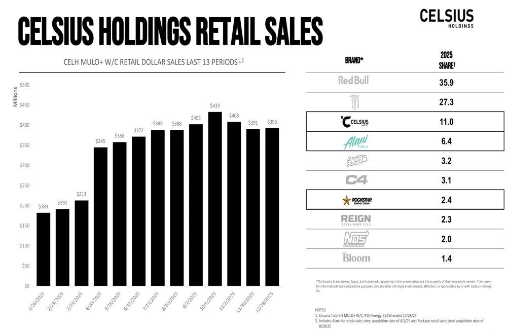 2025年财报显示,整合后的Celsius市场份额接近20%,直追红牛的35.9%和魔爪的27.3%,零售销售额同比增长22%。而前一年Celsius还处于负增长区间。值得注意的是,Alani Nu为Celsius贡献了101%的增长,在逆袭中功不可没。
