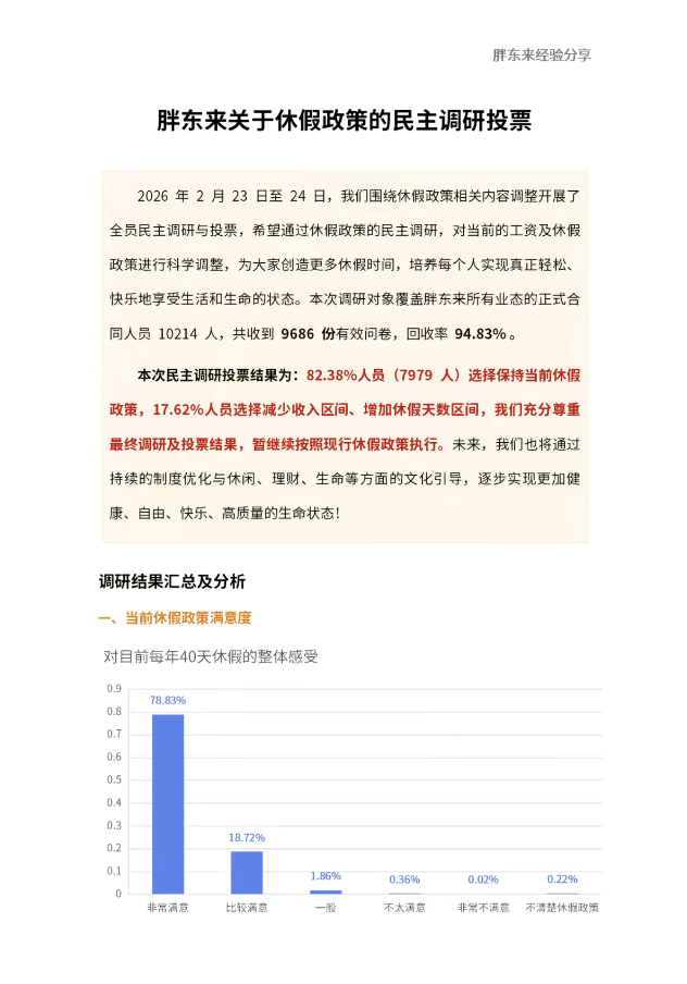 休假满意度:针对每年40天休假,78.83%员工表示非常满意,18.72%认为比较满意,整体满意度达97.55%;76.32%的员工觉得现有休假“完全能够”保障休闲需求与生活幸福感。