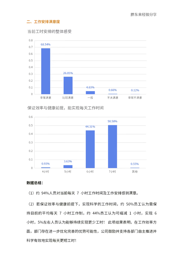 工时满意度:对于每日7小时工作安排,68.54%员工非常满意,26.05%比较满意,合计满意度约94.6%;在保证效率与健康的前提下,50.58%倾向维持7小时工作制,44.31%希望缩短至6小时。